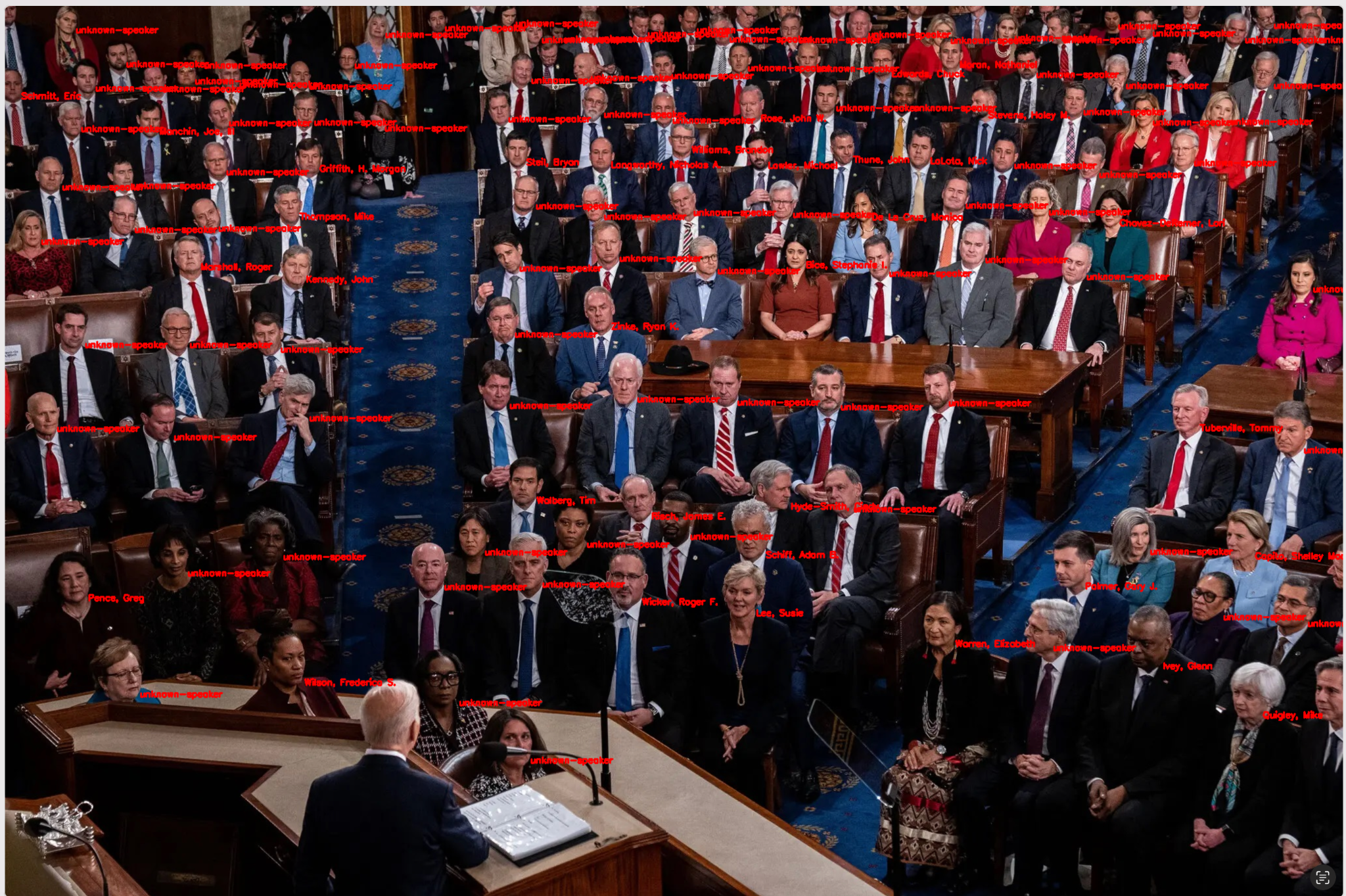 Matched faces against a dataset of lawmakers using embeddings, labeling recognized individuals or marking as "Unknown".